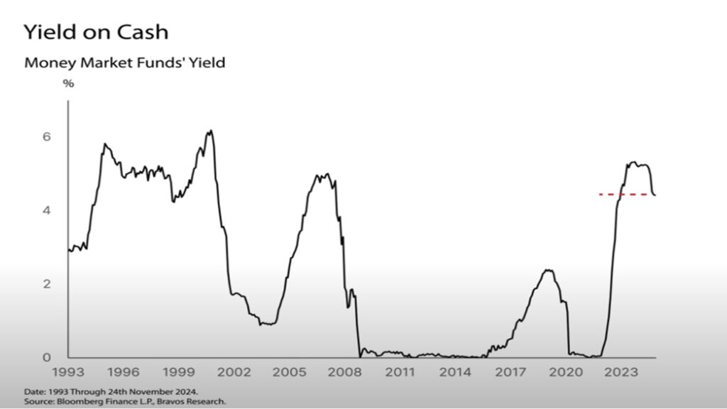 • Yield from cash or cash equivalents decades high ? While Goldman Sachs forecasted the S&P 500 Index could only deliver a 3% annual return for the next 10 years. (According to CNBC, and David Kostin of Goldman Sachs).  Putting money in cash or cash equivalents is a sound decision to collect 5% risk free income.